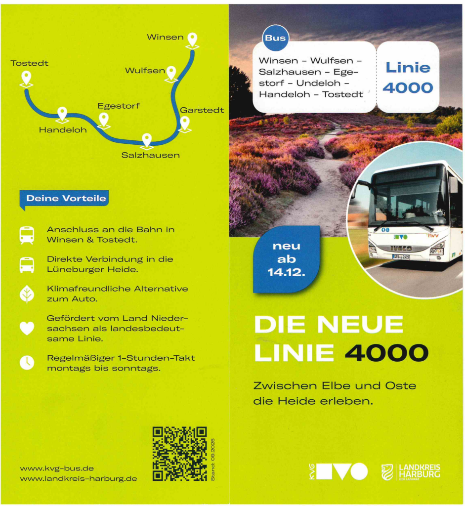Die Linie 4000 fährt Regelmäßig im 1 – Stunden – Takt montags bis sonntags. Die Fahrt dauert ca. 1 Stunde 40 Minuten. Sie bietet Pendlern aus den Heideorten die Möglichkeit, eine direkte Verbindung nach Winsen / Luhe oder nach Tostedt aufzunehmen. Somit können auch die hier befindlichen Bahnhöfe , entweder Winsen / Luhe > Hamburg oder Winsen / Luhe > Lüneburg / Hannover, sowie Tostedt > Hamburg oder Tostedt / Bremen erreicht werden. In Handeloh besteht dann auch die Verbindung an die RB 38 über Soltau nach Hannover.